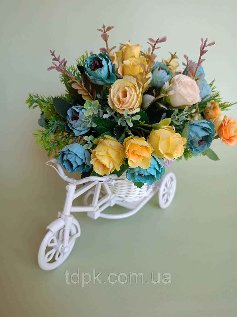 Композиція зі штучних квітів у жовто-бірюзових тонах. Виготовлена з жовтих, жовто-жовтогарячих троянд, бірюзових маків, зелені. Композиція зібрана в кашпо як велосипед. Розмір 25 см. довжина х 19 ширина х 24 см. висота